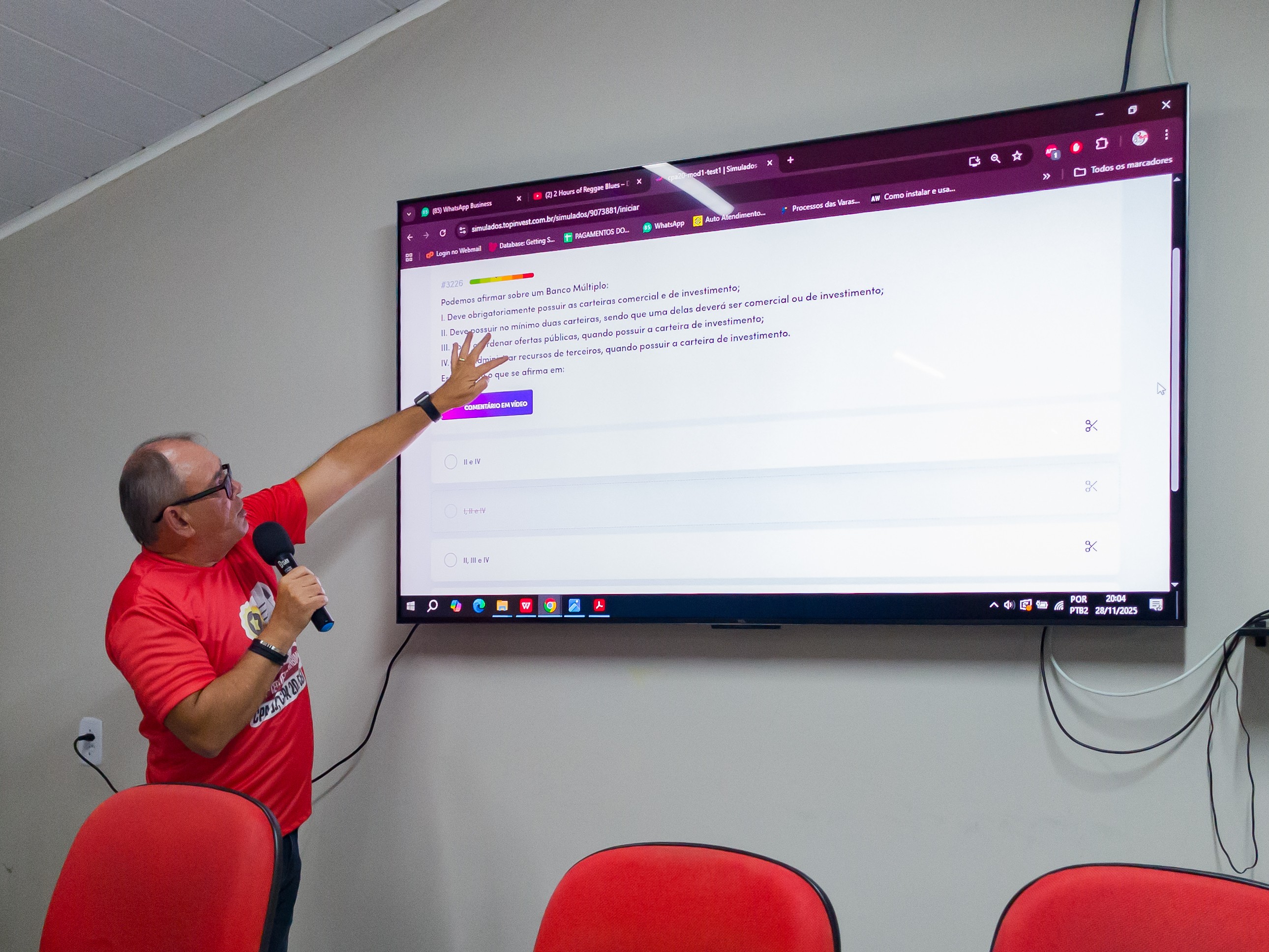 No segundo dia, os participantes retornaram para uma revisão aprofundada dos conteúdos exigidos nas certificações ANBIMA. A atividade contou com a resolução de questões, análise dos temas mais cobrados e direcionamentos estratégicos para otimizar o desempenho nas provas.