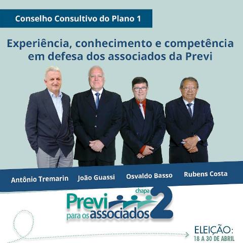 Por isso, a Chapa 02 “Previ para os associados”, traz candidatos com experiência de gestão, capacidade de diálogo e contam com apoio da maioria das entidades sindicais e associativas de todo o país. Ingredientes fundamentais para defender os planos de benefícios e seus participantes.