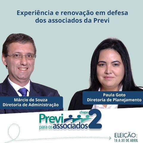 A Chapa 02 – Previ para os associados é composta por Paula Goto, filiada ao Previ Futuro, como candidata à diretoria de Planejamento e Márcio de Souza, atual gerente de benefícios da Previ, como candidato a diretor de Administração. Aos dois se somam mais 12 candidatos aos conselhos Deliberativo, Fiscal e Consultivo; todos trazendo na bagagem experiência de gestão e compromisso com a defesa dos direitos dos associados. Com a missão de trabalhar para proteger o patrimônio de quase 200 mil participantes da Previ e pela ampliação de seus direitos.